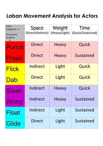 Laban Movement Analysis is a theoretical and experiential system for the observation, description, prescription, performance and interpretation of human moment. This can be used in acting and dance to create an emotional response from the audience. Rudolf Laban identified four factors of movement: